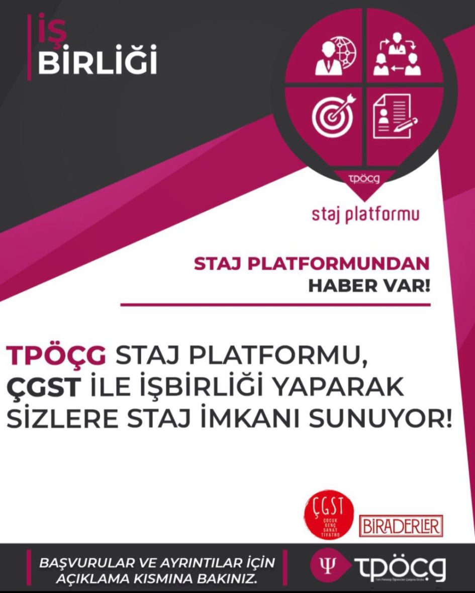 ÇGST PLATFORMU/ ÇOCUK GENÇ SANAT TİYATRO ile işbirliği yaparak sizlere staj imkanı sunuyoruz. Eğer sizde ÇGST PLATFORMU ‘’HEP ÇOK HİÇ ’ projesinde staj yapmak ve dezavantajlı bireylerle çalışmak istiyorsanız başvuruları kaçırmayın!