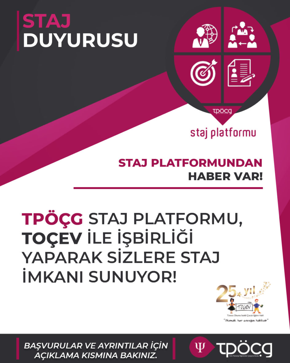 Sizlere dönemin ilk staj olanağını sunmaktan mutluluk ve gurur duyuyoruz. Kuruluşundan bu yana psikoloji öğrencilerine staj deneyimi sunmak için sıkı bir şekilde çalışan TPÖÇG Staj Platformu Ekibi olarak, TOÇEV(Tüvana Okuma İstekli Çocuk Eğitim Vakfı) ile işbirliği yaparak sizlere staj olanağını sunuyoruz. İstanbul’da 1 TEMMUZ-31 AĞUSTOS tarihlerinde TOÇEV’in farklı pozisyonlarında staj yaparak deneyim kazanmak ve kendinizi geliştirmek istiyorsanız, başvuru formunu doldurun!